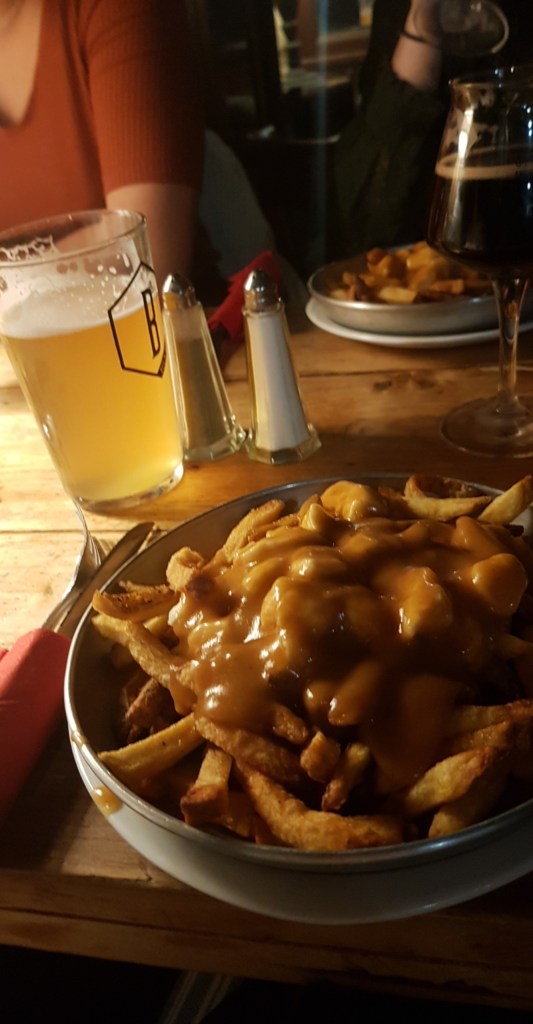 Pour le service, si vous voulez des boissons, c’est service au comptoir, on ne va pas vous les apporter à votre table. Les bières sont affichées sur un tableau, avec le degré et les arômes que vous allez retrouver dedans. Si vous voulez manger, il faut réserver, là, le service se fait directement à la table mais seulement pour les plats que vous voulez, un/une serveur.se, viendra vous les apporter. J’ai goûté à la poutine qui est très bonne, ainsi que le burger qui suffit pour un repas et les tacos à partager qui sont vraiment bons !!